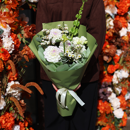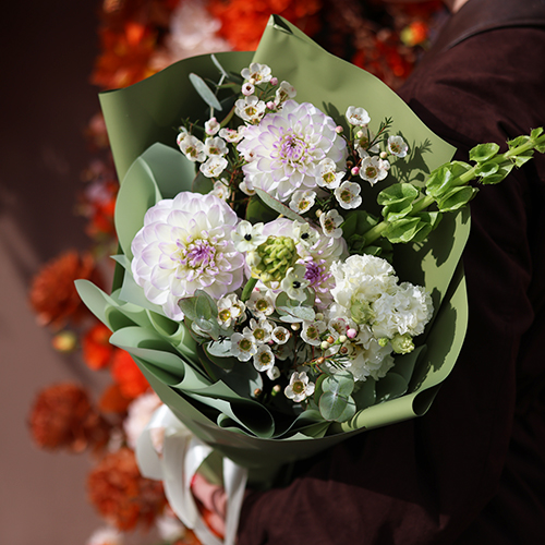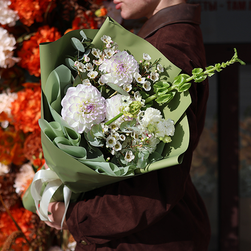 Букет "Ольга" из георгин, молюцеллы, эустом, хамелациума и орнитогалума