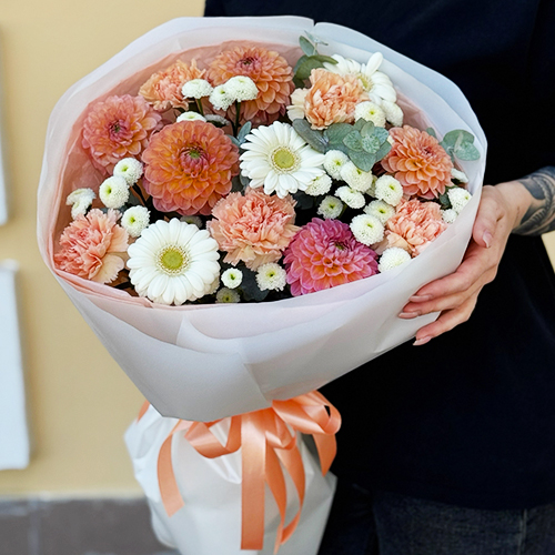 Букет "Персиковый латте" из георгин, диантусов, гербер и хризантем сантини