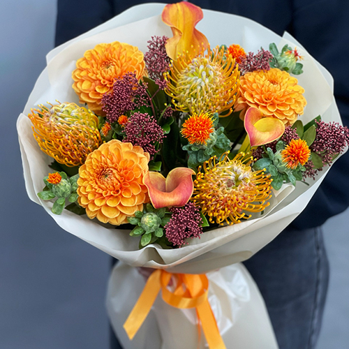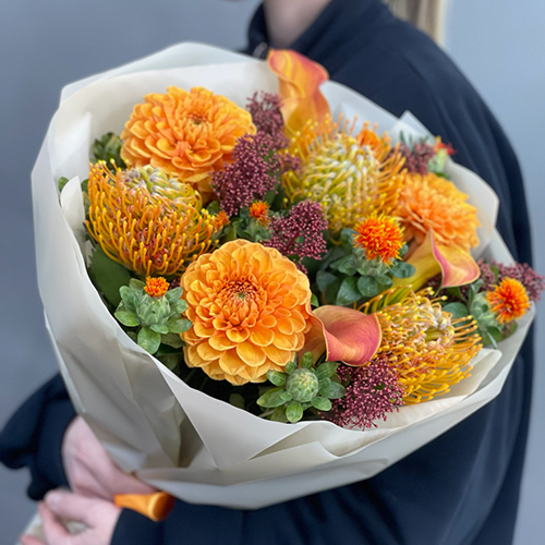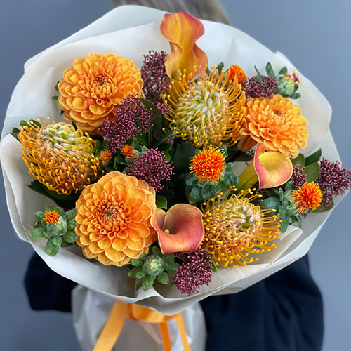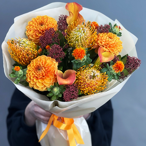 Букет "Пейзажи Левитана" из калл, лейко, георгин, скиммии и занзибара