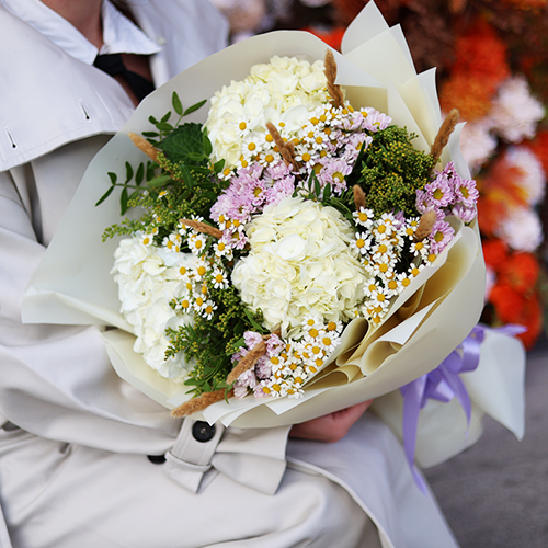 Букет "Zero" из хризантем сантини и гортензий