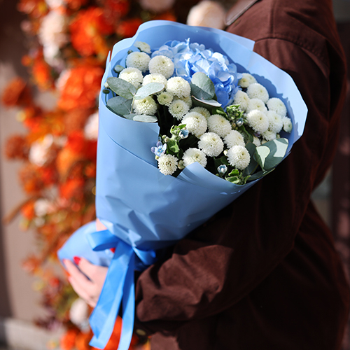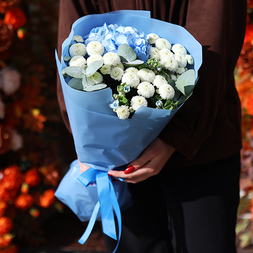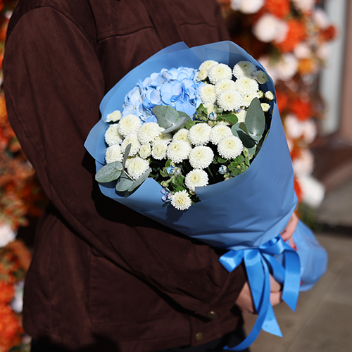 Букет "Белое небо" из хризантем Ньютон, оксипеталума и гортензии