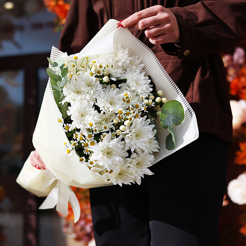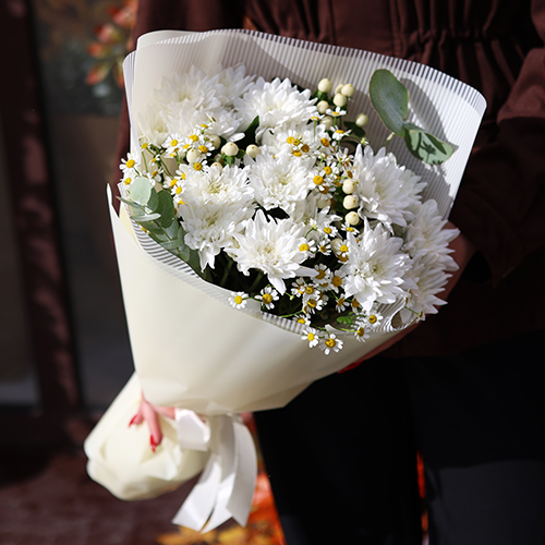Букет "Маленькая радость" из хризантем, гиперикума и ромашек