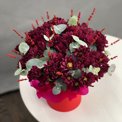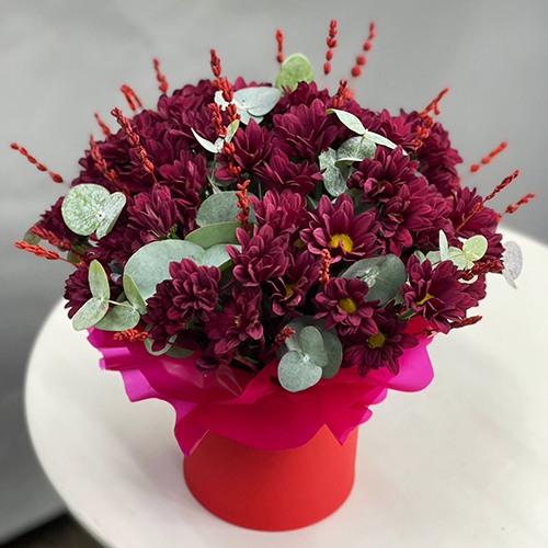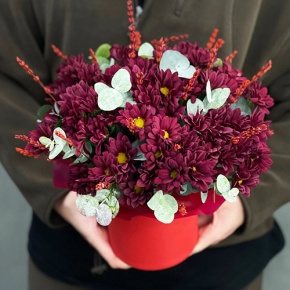 Композиция в шляпной коробке "Кристалл" из хризантем и лаванды