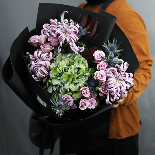 Букет "Бессоница" из хризантем Виена, сафари, кустовых роз, Голландской гортензии и эрингиума