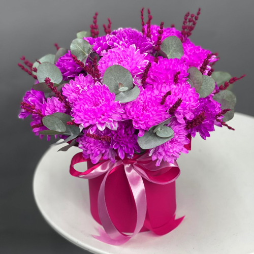 Композиция в шляпной коробке "Магия розового" из хризантем и лаванды