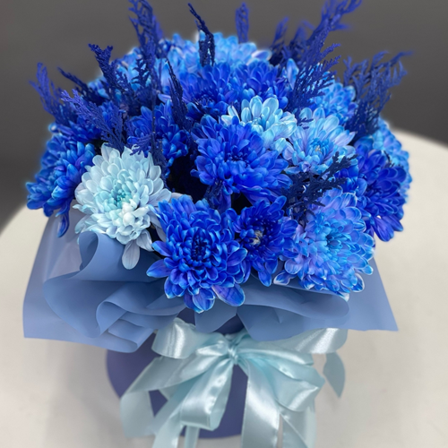 Композиция в шляпной коробке "Магия синего" из хризантем и конифера