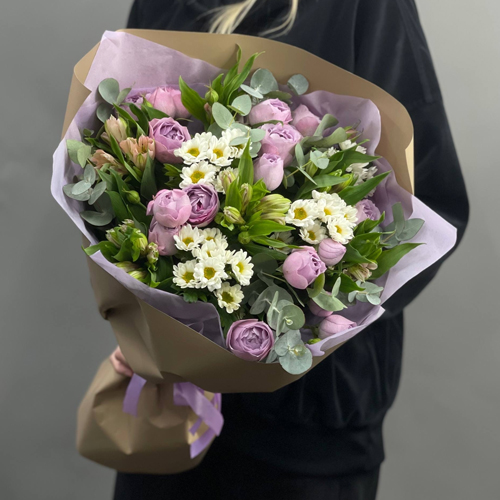 Букет "Парадайз" из кустовых пионовидных роз, альстромерий и хризантем сантини
