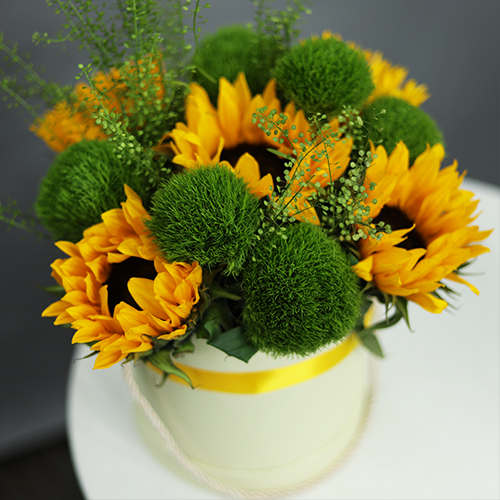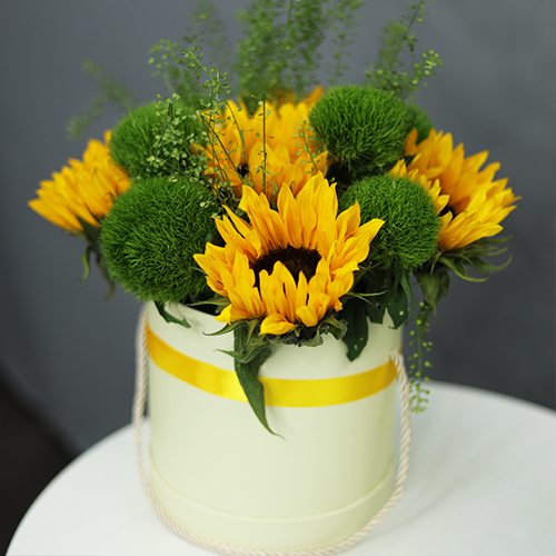 Композиция в шляпной коробке из подсолнухов и диантусов люкс