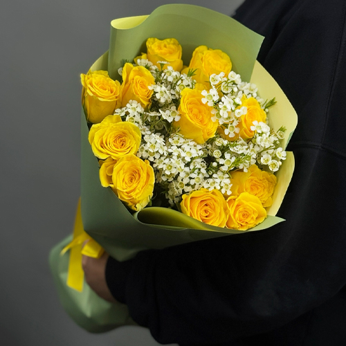 Букет "Нотка счастья" из лимонных роз и хамелациума (40 см)