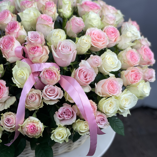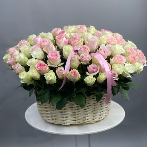 Композиция в корзине из 101 кенийской розы пастельный микс (40 см)