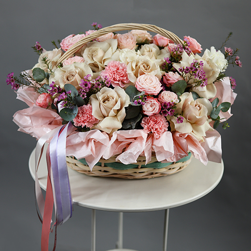 Композиция в корзине "Диодора" из французских роз Квиксенд, диантусов и кустовых пионовидных роз Бомбастик
