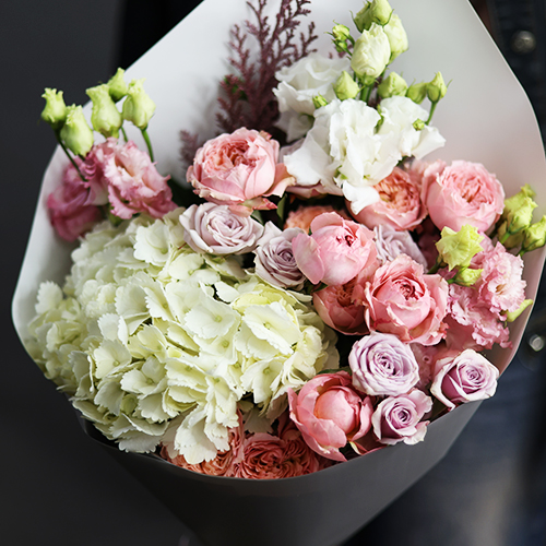 Букет "Иконика" из гортензий, кустовых пионовидных роз Джульетта и эустом