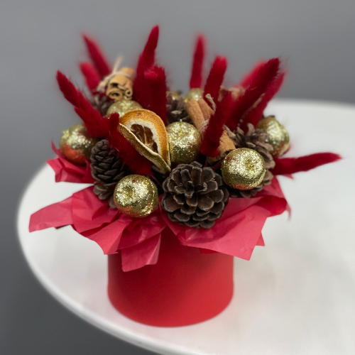 Композиция в шляпной коробке "Глинтвейн золото" из шишек, корицы и лагуруса